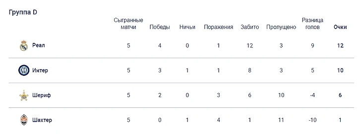 Какой же «Шериф» крутой и как же жалко «Шахту» . Видите у «Реала» цифру один в графе «поражения»? Так вот это «Шериф» «напортачил» ! После второго тура команда , из 11 легионеров в основном составе шла на первом месте , казалось , вот она – «тёмная лошадка» , однако сказка наполовину закончилась , ведь и участие в Лиге Европы для «Шерифа» неплохой результат . Последний тур «Реал» – «Интер» – это вопрос , кто выходит первым из группы , кто – вторым . Ну а «Шериф» приедет к «Шахтёру» сыграть в молдавский , спокойный футбол .