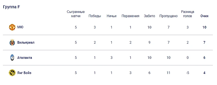 «Красные дьяволы» обеспечили себе выход в плей-офф , однако ни один матч «Юнайтеда» нельзя назвать лёгким и спокойным , а когда в первом матче «МЮ» на последних минутах пропустил от «Янг Бойз» и получил 0 очков вместо одного , то казалось , что для «МЮ» всё может очень плохо закончится . К большому счастью для «Красных» в их составе играет Роналду, приносивший в каждом матче результат . В последнем туре нас ждёт битва за второй билет в плей-офф и за место в Лиге Европы . «Аталанта» с «Вильяреал» будут решать , кто пройдёт дальше , а кто останется , а «МЮ» дома сыграет с «Янг Бойз» . У швейцарской команды есть даже шансы на попадание в ЛЕ , если «Жёлтая субмарина» победит «Бергамасков» .В общем вопрос о выходе из группы остаётся открытым .