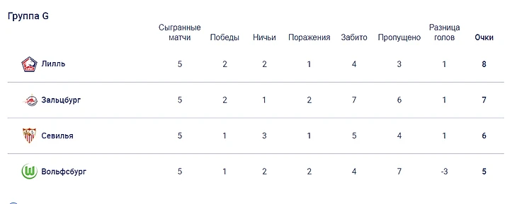 Группа G получилась достаточно сбалансированной . Четыре очень крепкие команды за пять туров не выявили сильнейшего , и в последнем туре даже у «Вольфсбурга» есть шансы на выход в плей-офф , но тем интересней будет понаблюдать за матчами , а нас с вами ждёт «Зальцбург» , принимающий «Севилью» и борьба первого и последнего места:»Вольфсбург» – «Лилль» .
