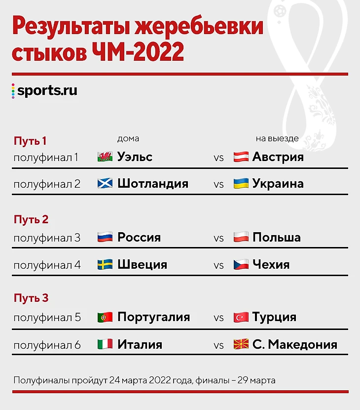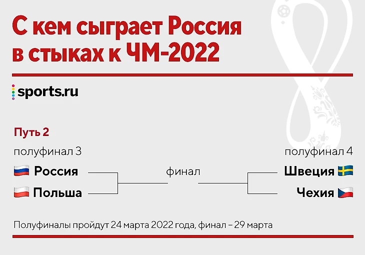 В полуфинале России выпала Польша. Победитель пары (надеемся, это будет команда Валерия Карпина) 29 марта сыграет с победителем пары Швеция – Чехия. Победа здесь принесет путевку в Катар.