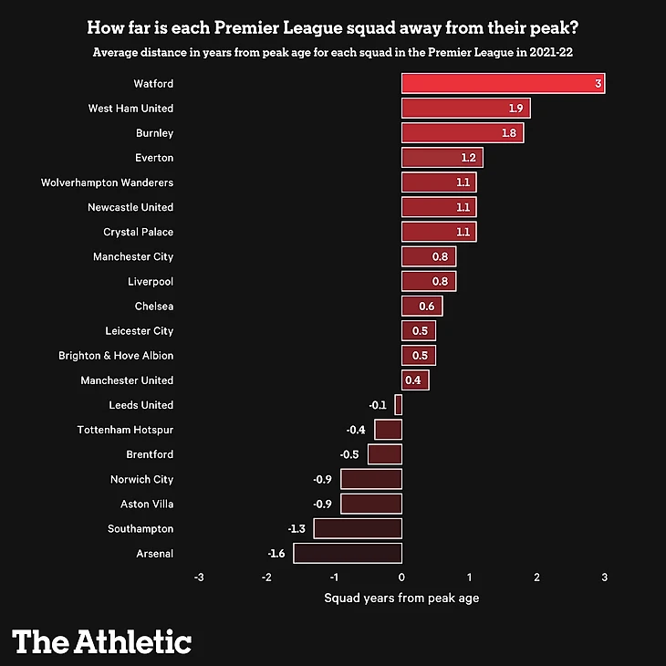 Диаграма показывает, на сколько лет средний возраст команды опережает или отстает от среднего возраста расцвета футболиста в Премьер-лиге. Так, получается, что игроки «Уотфорда» миновали свой «золотой» возраст три года назад, а у игроков «Аресенала» есть ещё полтора года, чтобы достичь идеальных кондиций. Конечно давайте оговоримся, что тут все условно, как и все статистические выкладки в целом и выводы на их основании.