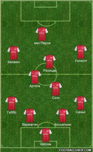 "Арсенал" (4-3-3): Щесны - Санья, Косельни, Вермален, Гиббс - Сонг, Артета, Росицки - Уолкотт, Бенаюн, ван Перси.