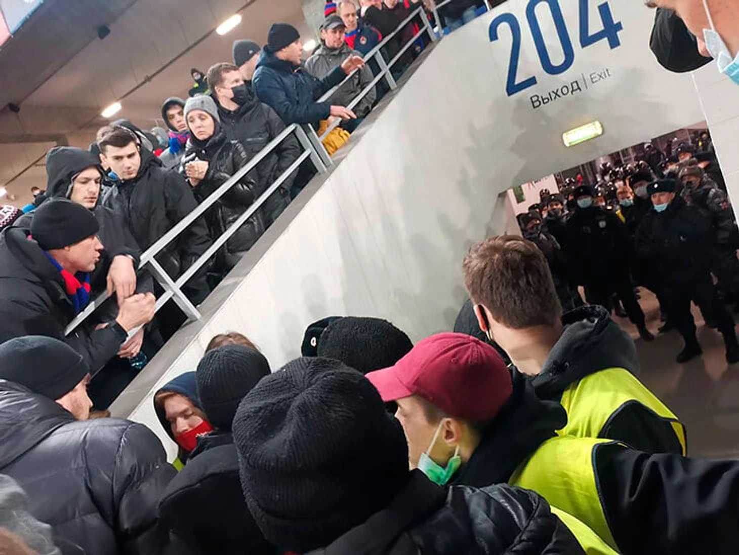 • Задержания происходили в течение трех с половиной часов после матча, болельщиков с трибуны C выводили небольшими группами, обыскивали и увозили в автозаках. ОМОН начал покидать стадион примерно в 1:20 (матч завершился до 22:00), остальных болельщиков отпустили. Они провели все это время на улице, в Москве было около +2, ощущавшиеся по данным метеосервисов как –1.