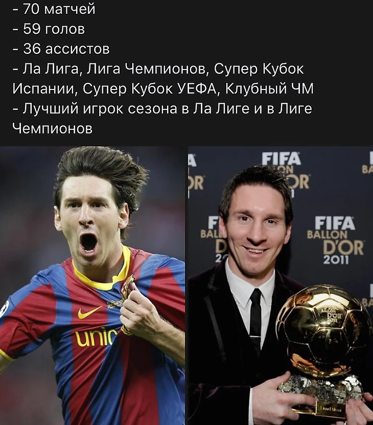 2011 год. Лионель Месси признаётся лучшим игроком в третий раз. Он становится единственным в истории футбола, кто взял 3-ЗМ подряд и повторяет рекорды ( Марко Ван Бастена, Йохана Кройффа и Мишеля Платини)