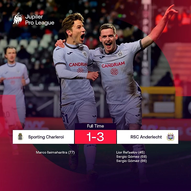 У «Шарлеруа» была парочка неплохих отрезков: в самом начале матча и в середине второго тайма. Первый ни к чему не привел, а вот второй завершился точным дальним ударом Илаймахаритры на 77-й минуте. К тому моменту «зебры» уже пропустили дважды. Счет открыл Рефаэлов, который вернулся в стартовый состав после того, как просидел в запасе весь матч против «Кортрейка», а удвоил преимущество Гомес: мяч после его подачи со штрафного никого не коснулся и запрыгнул в сетку. После того «зебры» сократили отставание, инициативу снова перехватил «Андерлехт». Коффи отразил опаснейший удар Куаме, но не справился с пенальти Гомеса. Снова отстав на два мяча, хозяева опять побежали отыгрываться и забили уже в добавленное время, но гол после просмотра повтора отменили из-за фола в атаке. «Мы расстроены, потому что как следует подготовились к этому матчу, но сами отдали игру», – говорит главный тренер «Шарлеруа» Эдвард Стилл.