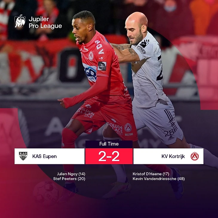 Открытый футбол привел к тому, что на старте команды забили трижды за шесть минут: наказали друг друга забросами из глубины за высокую линию обороны, а затем «Эйпен» опять вышел вперед – голевая комбинация, кажется, началась с фола Эри против Селемани в атаке, но пересматривать эпизод судьи не стали. Это явно разозлило гостей. Они прижали соперника к воротам и делали это до конца игры. Натиск принес результат в начале второго тайма. Вратарь Нурудин ошибся под прессингом от Гейе и привез пенальти, срубив Вандендриссхе в штрафной. Голкипер исправил ошибку, отбив мяч за лицевую линию после удара Селемани с точки, но как раз с последовавшего углового «Кортрейк» сравнял счет. А сделал это все тот же Вандендриссхе. Пожалуй, Кевин – лучший игрок матча. Нурудин же – лучший игрок «Эйпена»: у него целых шесть сейвов. «Мы заслуживали большего, учитывая, как складывался второй тайм», – убежден капитан «Кортрейка» д'Ане.