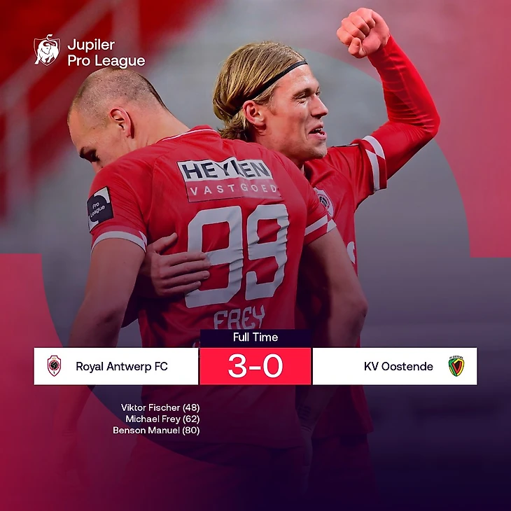 «Остенде» опускается все ниже. Прибрежная команда ничего не придумала в атаке и слабо отыграла в обороне. Как следствие – пятое подряд поражение в лиге. От зоны стыковых матчей «Остенде» теперь отделяют всего четыре очка. «Прямо сейчас у нас нет достаточно уверенности в себе, чтобы выбраться из сложившейся ситуации», – признался главный тренер «Остенде» Александр Блессин. У «Антверпена» дела идут гораздо лучше: он реабилитировался за поражение от «Сент-Трюйдена» и сократил отставание от «Юниона» до четырех баллов, воспользовавшись осечкой лидера. У Бриана Приске – большие амбиции: «Конечно, мы разочарованы тем, что вылетели из Кубка Бельгии и Лиги Европы, хотя, если судить именно по игре, наша еврокубковая кампания была неплохой. Теперь сосредоточимся на чемпионате. Главная цель – побороться за титул в мае». А почему бы и нет?