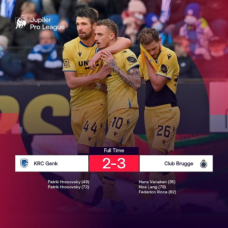 «Генк» очень бодро начал матч и заставил оборону «Брюгге» напрячься. Уже на 10-й минуте забил Трезор, но гол не засчитали из-за нарушения Торстведта против Хендри, а вскоре Бонгонда хлестко пробил в штангу. Только примерно с середины тайма «Брюгге» стал постепенно набирать обороты и до перерыва вышел вперед: Ванакен оторвался от Грошовского и замкнул превосходный кросс Ланга. И вдруг игра перевернулась: ван дер Бремпт получил вторую желтую карточку и был удален. Из раздевалки «Генк» вернулся дико заряженным, принялся в большинстве терзать «Брюгге» и повел благодаря великолепному дублю Грошовского. Но если «Генку» на два гола потребовалось около получаса, то «Брюгге» – всего пять минут. Когда казалось, что гости уже в нокдауне, они воспрянули и сами обескуражили соперника. Полузащитник «Генка» Кристиан Торстведт – в шоке: «Матч был в наших руках, но мы упустили победу и шанс подскочить в турнирной таблице. Это было незрело, унизительно и недопустимо. Если это не повод разозлиться на самих себя, то я не знаю, что тогда».