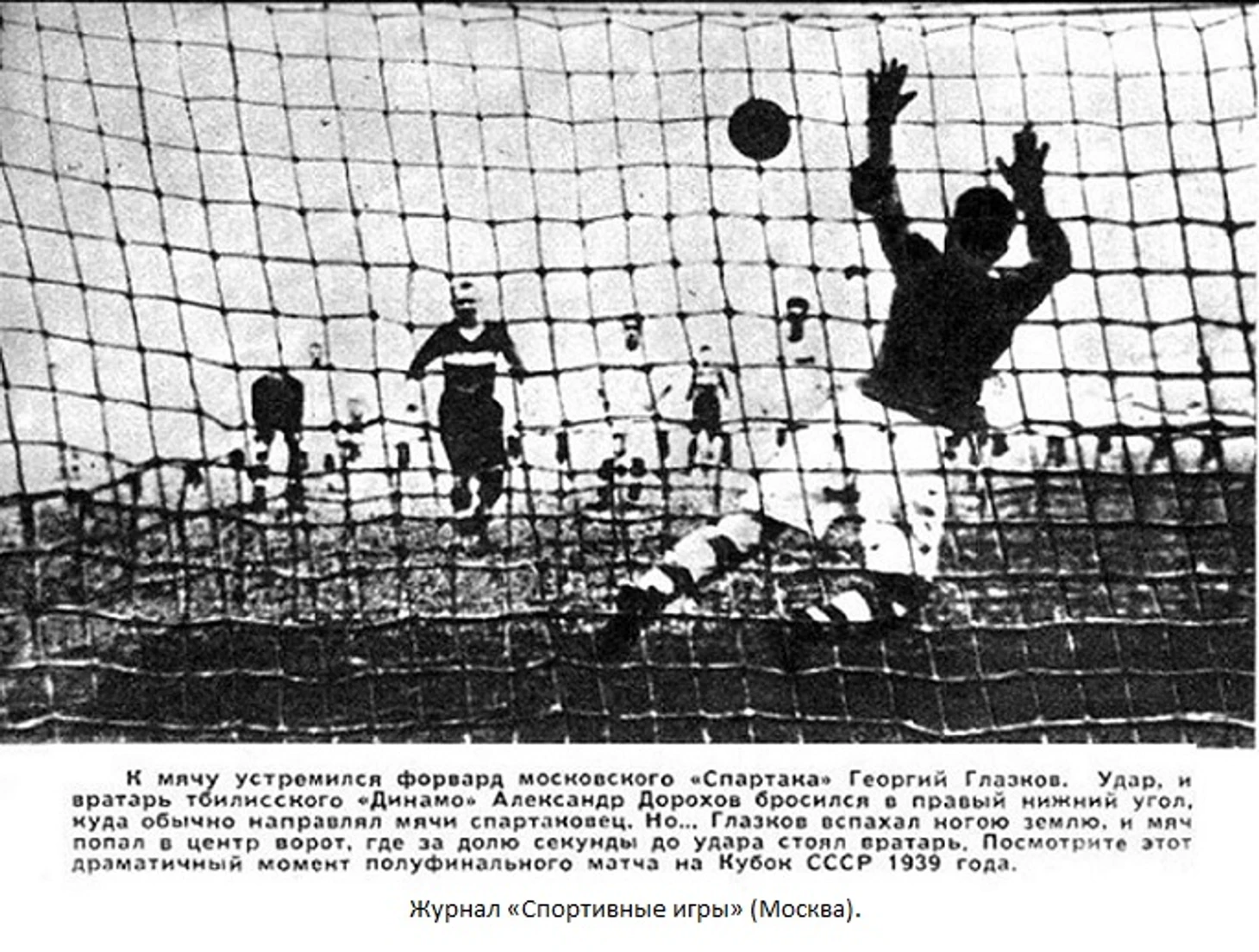 ... в 1939 году был разыгран матч, который для моего юного довоенного поколения был выше и главнее всех, когда-либо виденных. Без каких-либо обоснований вопреки спортивным установлениям переигрывался полуфинал Кубка между "Спартаком" и "Динамо" (Тбилиси) спустя три недели после финала. На всякий случай, если вдруг у кого-то возникла мысль о неблаговидной роли грузинской команды. Никто из касавшихся этой истории тбилисских футболистов не осуждал. Они вне упрека. Динамовцы, как и "Спартак", были пешками в затеянной "верными ленинцами" игре. Несмотря на отсутствие ряда ведущих игроков "Спартак" победил 3:2.Все три забил Глазков.