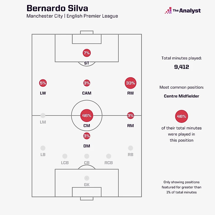 За время в АПЛ Силва перепробовал почти все позиции в средней линии. 7% игрового времени Бернарду пришлись на роль ложной девятки. 46% минут были связаны с классической ролью центрального полузащитника, еще 33% – с амплуа правого вингера.