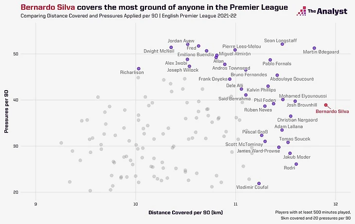 Цифры показывают: Силва вернулся к энергозатратному режиму. Бернарду – лучший игрок АПЛ-2021/22 по дистанции, покрываемой в среднем за 90 минут (11,9 км). Португалец – единственный игрок «Сити», который вошел в топ-10 чемпионата по показателю.