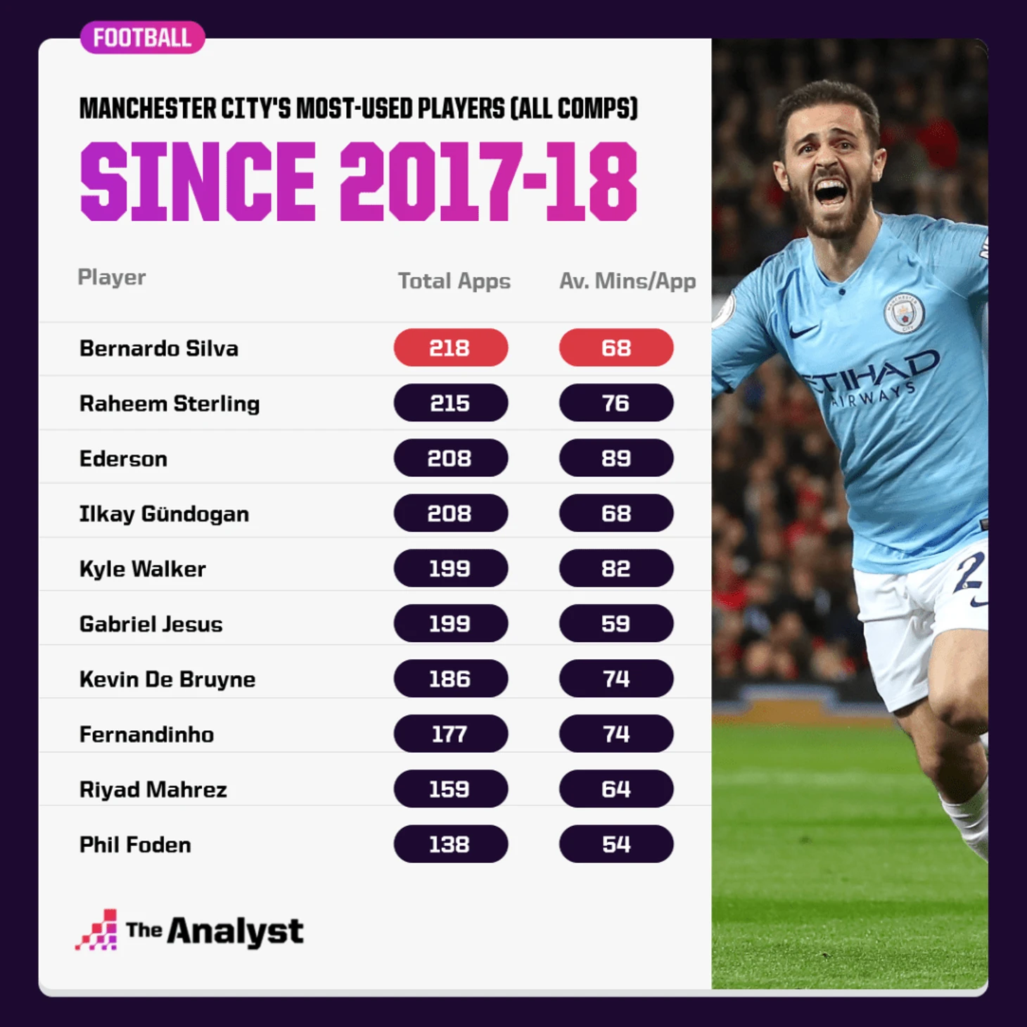В следующие два сезона число матчей Силвы в АПЛ сократилось до 23 и 24 соответственно. Несмотря на спад, Бернарду остался игроком с самой объемной практикой в «Сити» с 2017 года, когда приехал в команду. Минуты на поле подчеркивали важность хавбека для Гвардиолы.