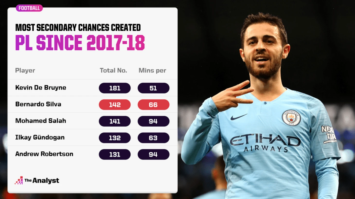 С года, когда Силва переехал в «Сити», только Кевин де Брюйне набил больше «вторичных пасов под удар». В АПЛ-2021/22 Бернарду лидирует по показателю (16). Еще португалец занимает третье место в лице по запущенным владениям, которые привели к удару (15). В топ-2 – Стюарт Даллас и Аллан, которым досталось больше игрового времени.
