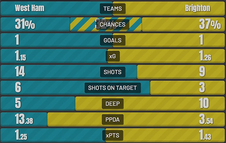 Что касается других статистических данных, то "Брайтон" был почти в 4 раза лучше в прессинге (показатель PPDA), нанес меньше ударов, но превзошел "Вест Хэм" по владению (66% против 34%).