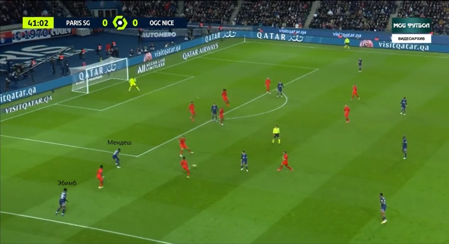 На левом фланге действовал треугольник Мендеш-Эбимб-Мбаппе. Здесь стоит отметить связку Эбимба и Мендеша, которые менялись позициями, и запутывали защитников. Например, обычно за ширину отвечал Мендеш, а Эбимб открывался в полуфланге. Но в эпизоде ниже приведён обратный пример.