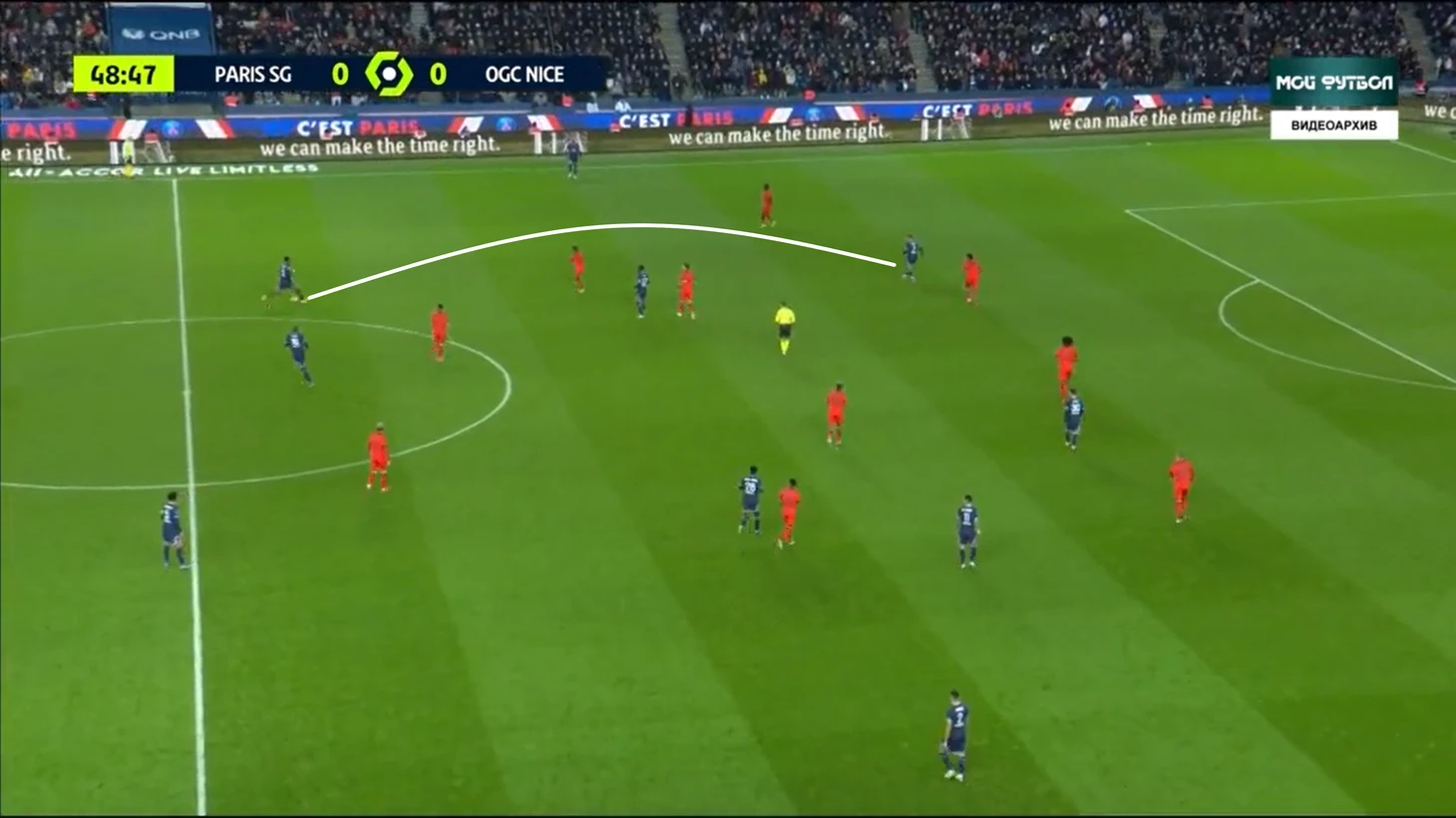 6. Парижане пытались взламывать оборону гостей создавая ситуацию 3-в-2 на флангах. На правом фланге у ПСЖ взаимодействовал треугольник Месси-Хакими-Ди Мария. Их задачей была доставка мяча за спину левому защитнику соперников.