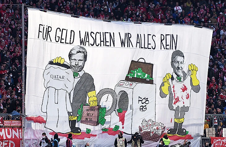 А пока болельщики и руководство продолжают войну. Еще до собрания акционеров на одном из матчей «Баварии» (в начале ноября против «Фрайбурга») появился баннер с изображениями Кана и Хайнера, которые отстирывали кровь с футболок Qatar Airways. Подпись: «Отмоем все за деньги».