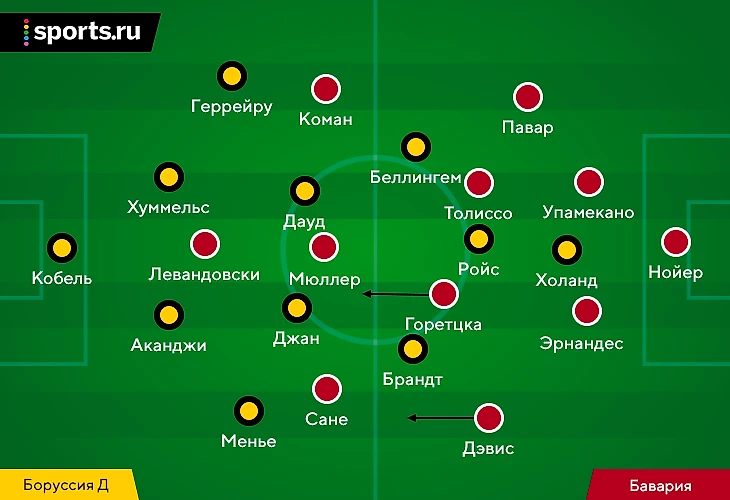 «Бавария» все еще обходится без Йозуа Киммиха – в центре поля пару Леону Горетцке составил Корантен Толиссо. «Дортмунд» в последнее время активно экспериментирует с формациями. В этот раз Розе выбрал очень узкие 4-2-3-1: Брандт и Беллингем лишь формально прикрывали края – на деле весь упор был сделан на перекрытие центра. Главным событием стал камбэк в стартовый состав Эрлинга Холанда (он уже даже забивал после травмы, но с «Вольфсбургом» выходил лишь на замену):