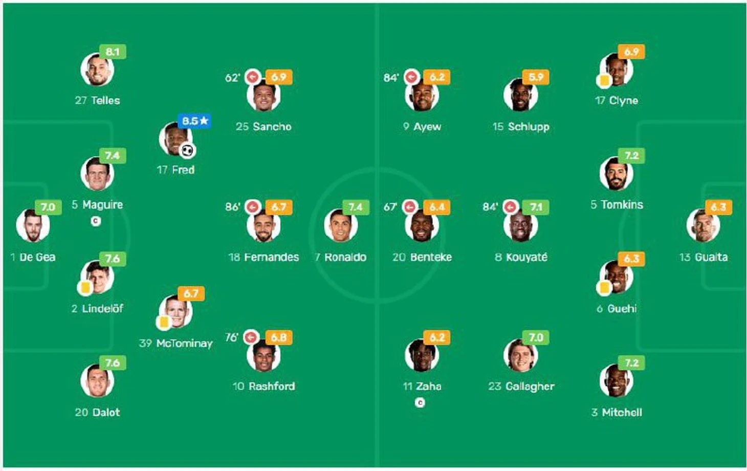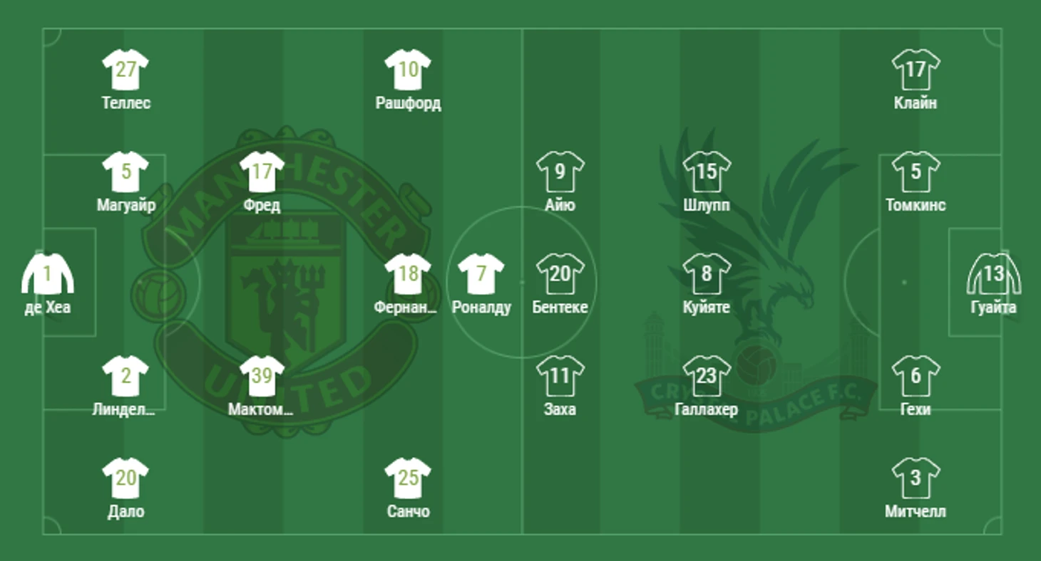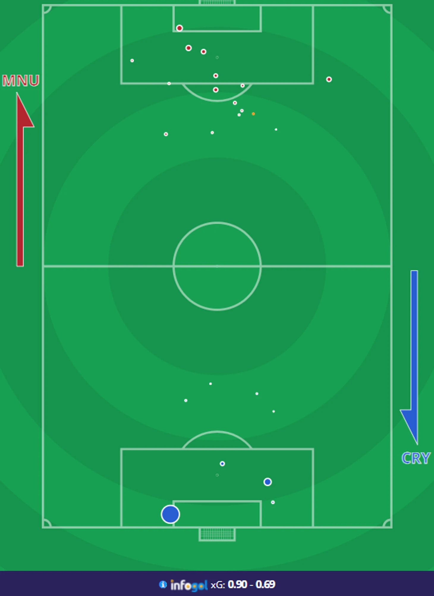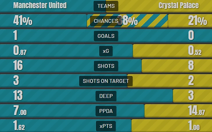 Игра Кристал Пэлас вышла весьма непонятной, поскольку Виейра явно рассчитывал на другой сценарий. Как минимум, он точно не планировал парковать автобус и играть почти без мяча. В первом тайме Стекольщики пару раз смогли приблизиться к воротам Де Хеа благодаря быстрым флангам и высокой линии защиты МЮ, но опасности не было.