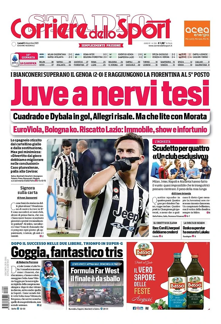 Бьянкоенри обыграли «Дженоа» (2:0) и догнали «Фиорентину» на 5 месте. Куадрадо и Дибала забили, Аллегри поднимается. Но каков конфликт с Моратой. Испанец разозлился из-за жёлтой карточки и замены. Макс затем минимизирует: «Получаем удовольствие от игры, должны улучшать завершение». Дело повышения стоимости, в игру вступает Covisoc.