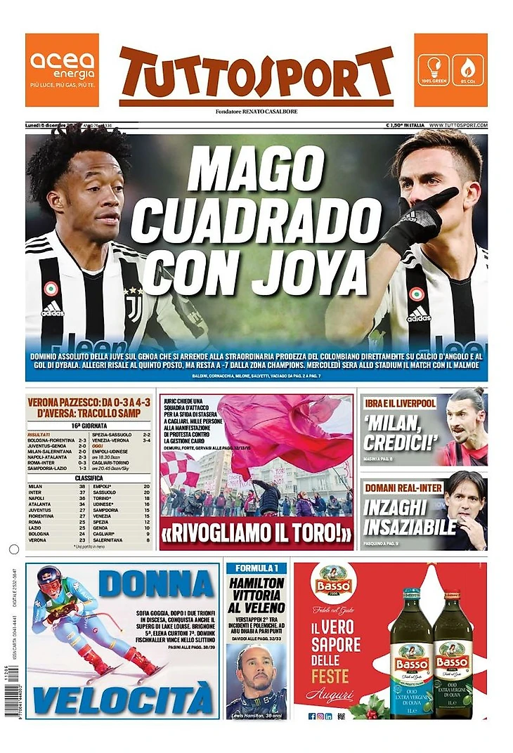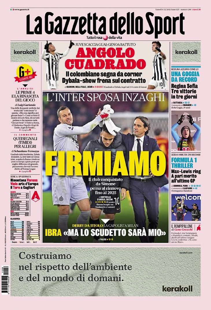 Волшебник Куадрадо с «Сокровищем». Заголовки Gazzetta, TuttoSport и Corriere за 6 декабря