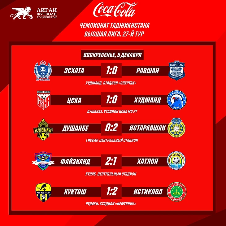 Вот и завершился тридцатый по счету чемпионат Таджикистана среди команд высшей лиги. И 27-ой заключительный тур поставил все точки над «и». Не смотря на то, что чемпион и серебренный призер уже были определены, судьба бронзовых наград и второго претендента на вылет решалось именно в последнем туре.
