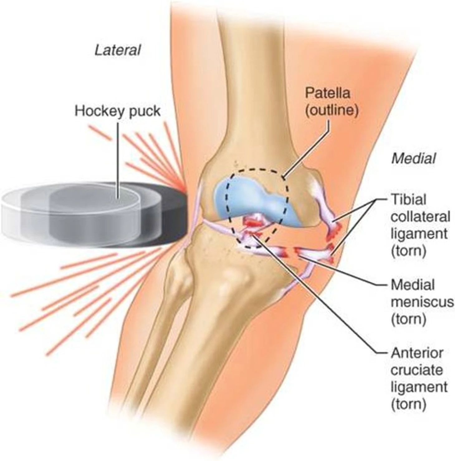 Механизм травмы является типичным для повреждения передней крестообразной связки — вальгусный, то есть подворот ноги внутрь при фиксированной голени. Но это еще не все. Если приложенная сила, будь то столкновение или просто неудачно поставленная нога, окажется слишком большой, то пострадать может может не только передняя крестообразная связка (ПКС), но и медиальный (внутренний) мениск, а также внутренняя боковая связка (она же медиальная коллатеральная). Как это работает?