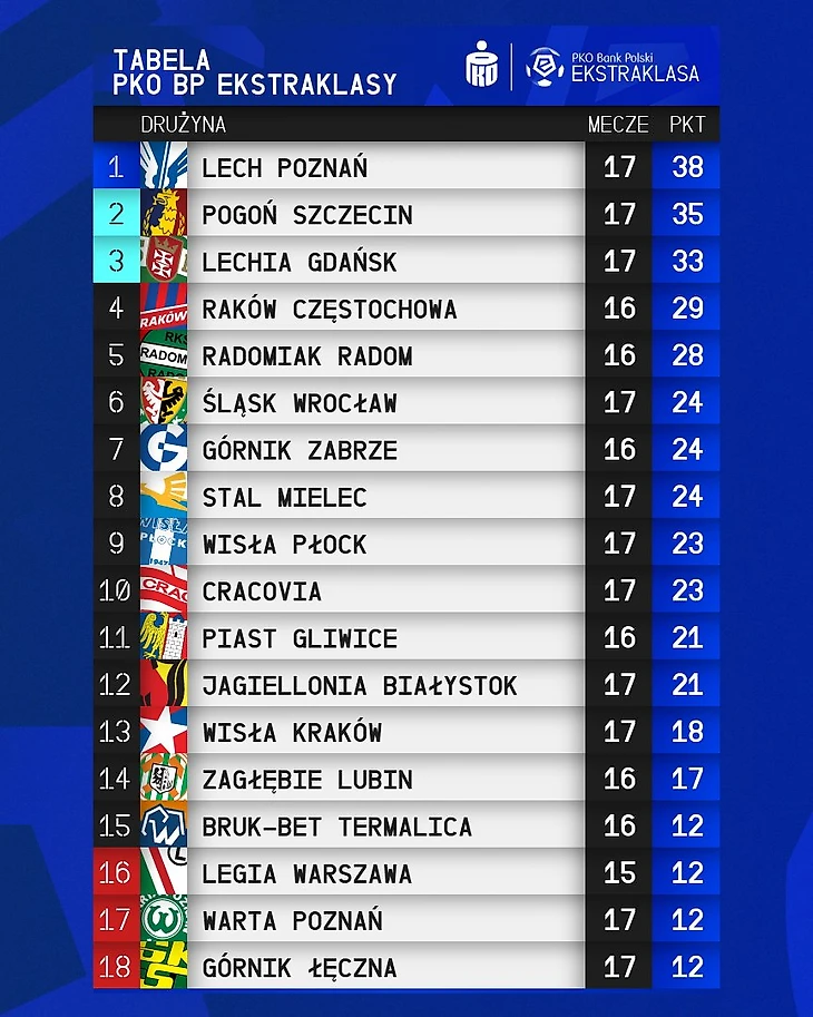 17-ый тур, прошедший в минувшие выходные, завершил 1-ый круг нынешнего сезона Экстракласы. «Легия», прервавшая серию поражений в минувшем туре, снова проиграла, «Ягеллония» продолжила раздавать очки аутсайдерам, а центральным матчем тура была игра в Гданьске, где «Лехия» играла с еще одним претендентом на титул.