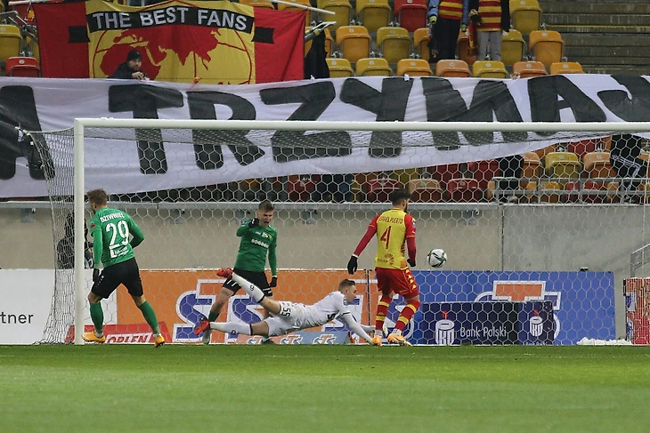 Прошло всего 40 секунд после стартового свистка арбитра, а гости уже праздновали забитый мяч. После подачи с фланга мяч в ворота Дзеконьского отправил Гонска. «Яга» выглядела очень слабо, практически не тревожа Гостомского в первом тайме. Нельзя сказать, что «зелено-черные» атаковали много, но это и не нужно делать, когда тебе мяч в простейшей ситуации дарит голкипер соперника. Молодой Дзеконьски допустил очередную результативную ошибку в Экстракласе, чем воспользовался Гонска, оформивший дубль. 0:2 к перерыву при той игре, которую показывали подопечные Мамрота, выглядели приговором для белосточчан.