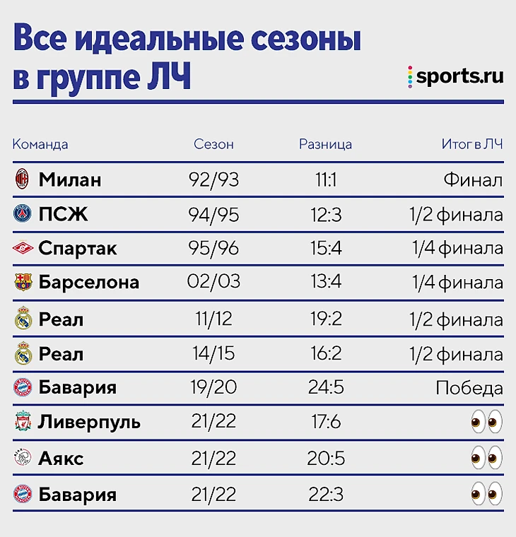 • Пока всего один раз идеальный групповой этап приводил к победе в Лиге чемпионов – это как раз «Бавария» того сезона, где Роберт Левандовски точно заслужил «Золотой мяч». Так что это лишь промежуточная приятная отметка, не более.