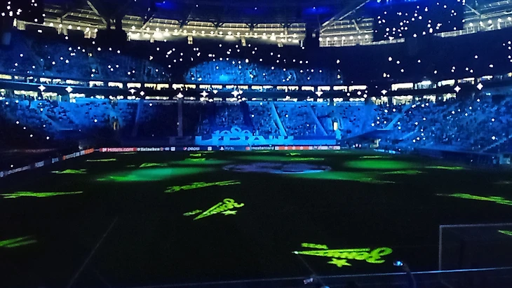 Перед выходом игроков на поле было прекрасное световое шоу в стиле арены "Юве". Европейский уровень. Ну а когда игроки вышли на поле, прозвучала легендарная музыка...