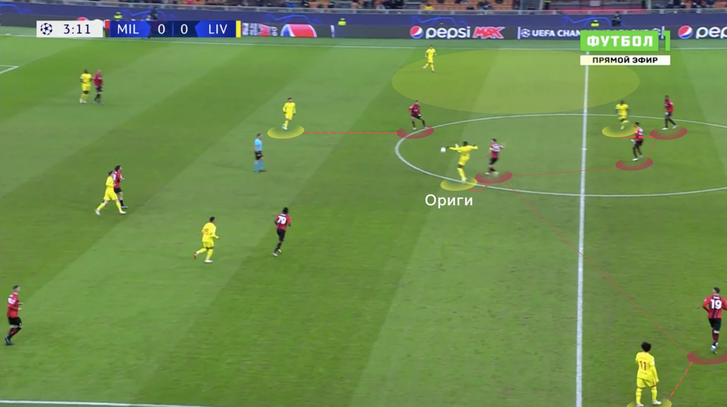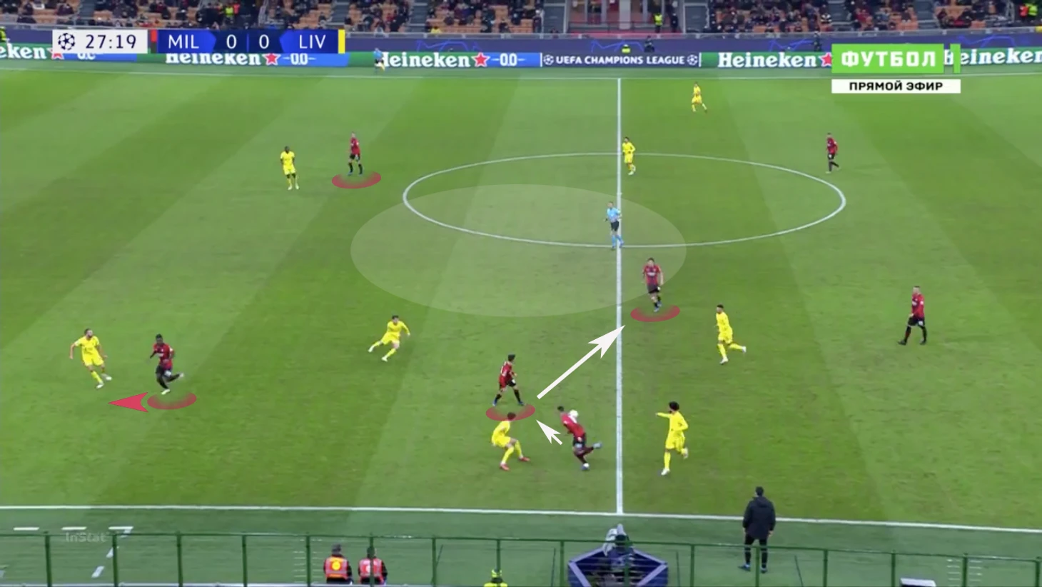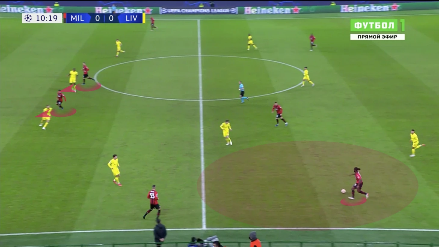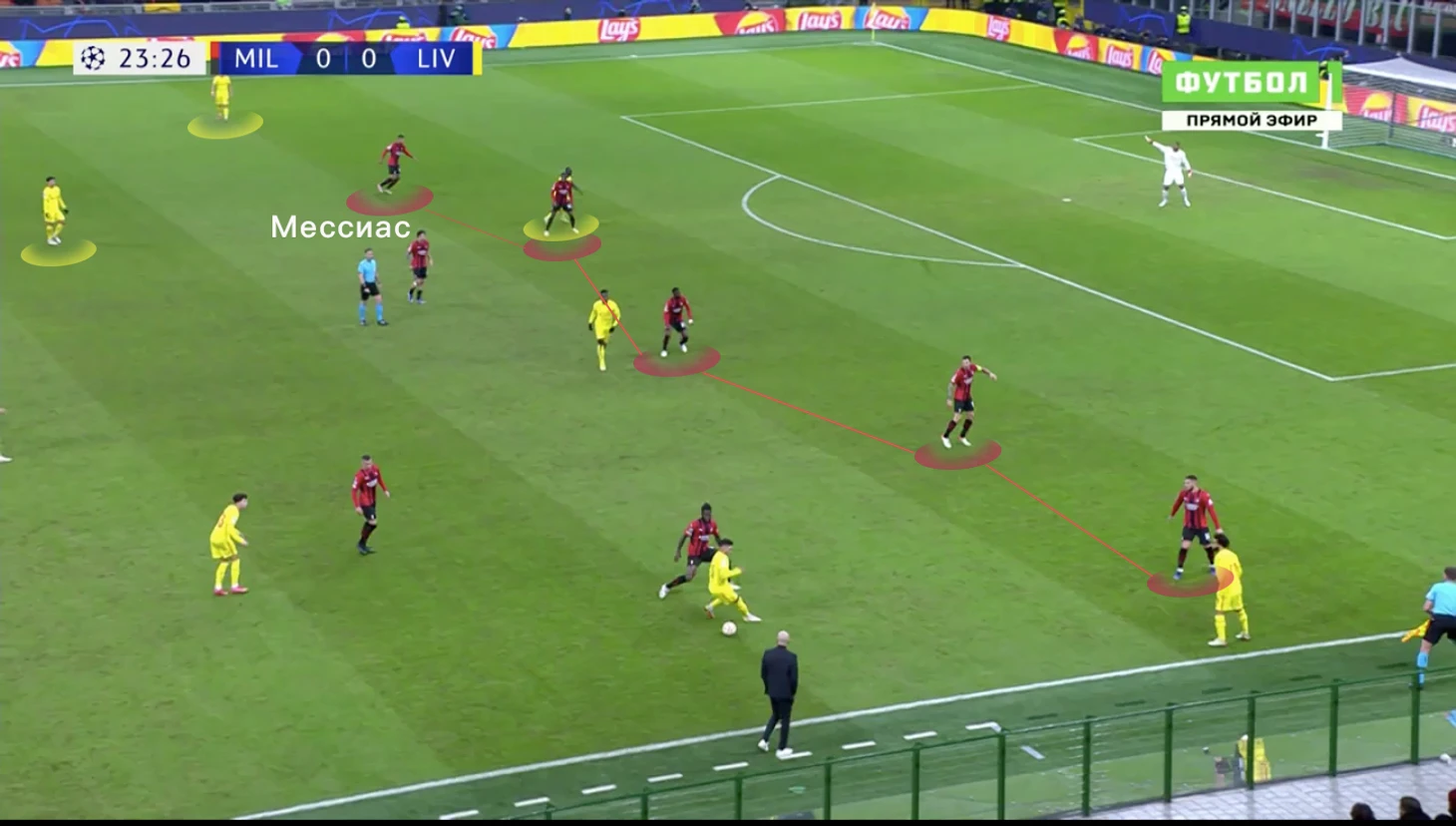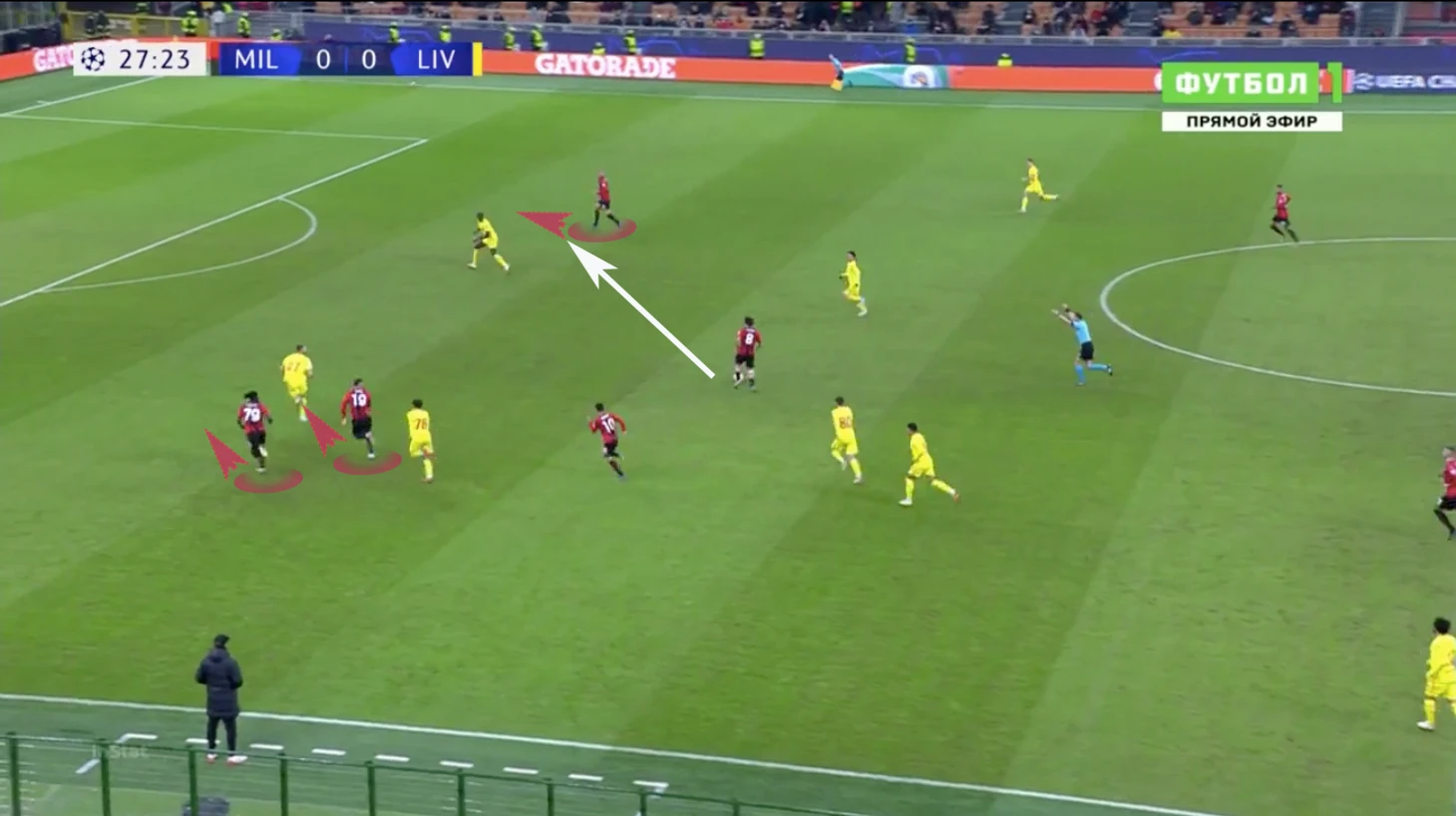 Россонери подходили к последнему матчу групповой стадии Лиги Чемпионов с достаточным количеством потерь. Помочь команде не смогли Кьяер, Калабрия, Ребич, Жиру и Леао. Отметим отсутствие последнего. Ниже разберемся, почему именно эта потеря сказалась на игре "Милана". Однако все эти потери никак не должны оправдывать миланцев, так как "Ливерпуль" приехал на "Сан-Сиро" лишенным турнирной мотивации и в полурезервном составе. Практически всю линию обороны и полузащиты составляли дублеры. Сама игра началась по сценарию первого очного матча, но с работой над ошибками от Пиоли как при владении, так и без мяча. Еще в сентябре Пиоли предложил интересную структуру прессинга. Тогда "Ливерпуль" без труда проходил давление соперника и пользовался преимуществом в центре поля. Сейчас общая идея осталась прежней, но с важным дополнением: