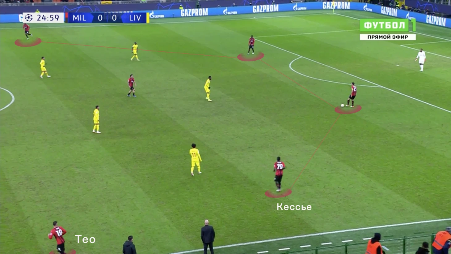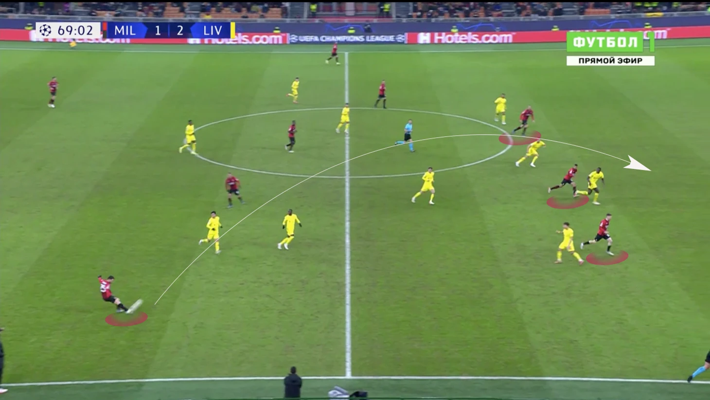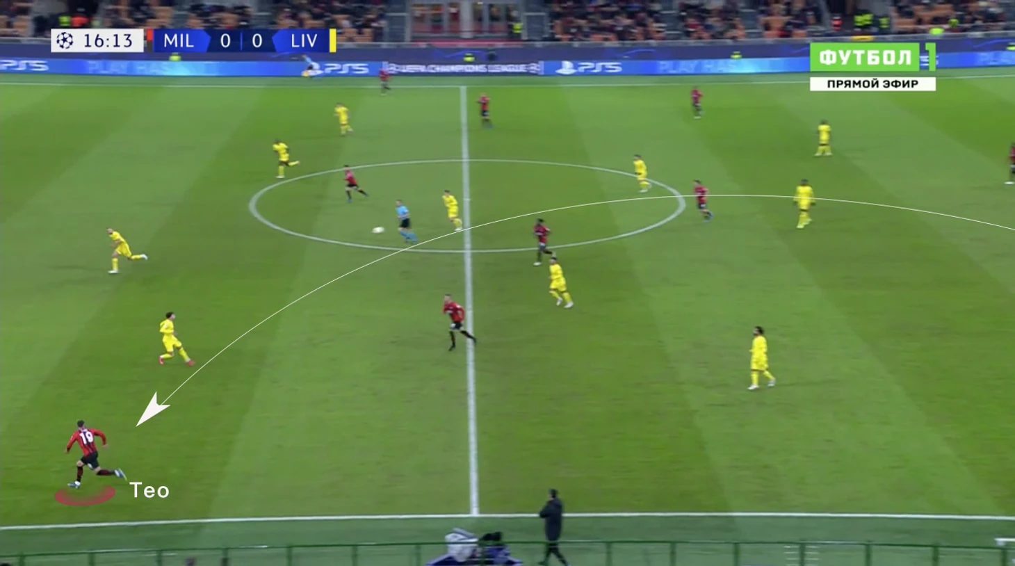 Делая такой акцент на фланговое продвижение в построении атаки, "Милан" пользовался компактностью блока соперника и относительной свободой в этих зонах, к тому же движение Кессье (этот паттерн, к слову, миланцы часто применяют и в других матчах) путало ориентировки "Ливерпуля". В итоге удавалось продвинуть мяч в среднюю треть поля, откуда хозяева начинали активную фазу атаки. Основной упор при обострении "Милан" делал на атаки пространства за спинами последней линии обороны. "Ливерпуль" всегда играет с высокой линией, а наличие неосновных исполнителей в конкретном матче еще больше приглашали соперника давить в эту точку. Именно тут бы очень пригодился Леао. Подобные атаки можно разделить на два основных типа. Первый – забросы из центральной оси во фланги, эксплуатирующие зоны за спинами крайних защитников. Там у хозяев особенно активно предлагал себя Тео Эрнандес, который часто оказывался изначально в высоких позициях, а его зону при билдапе занимал Кессье: