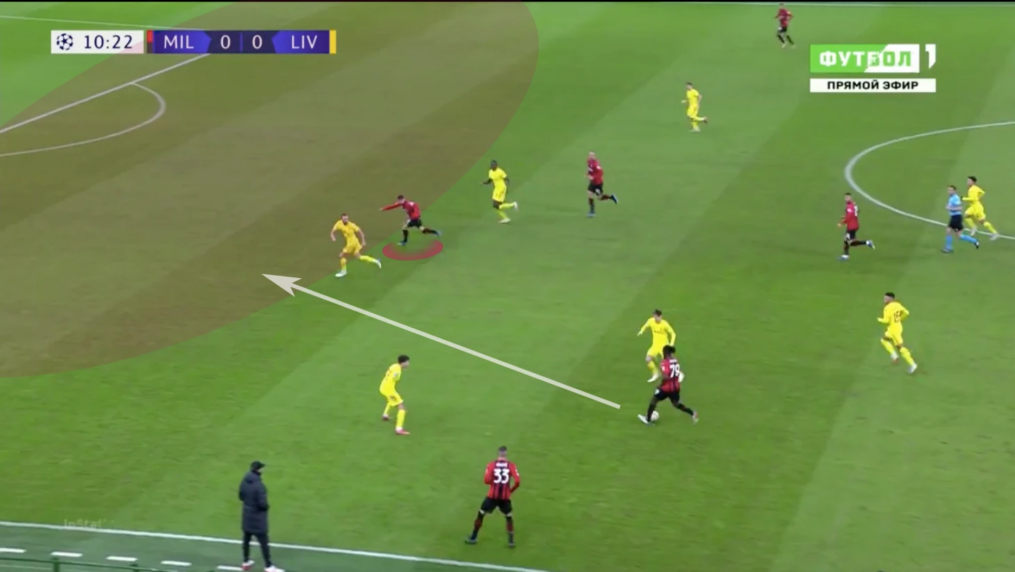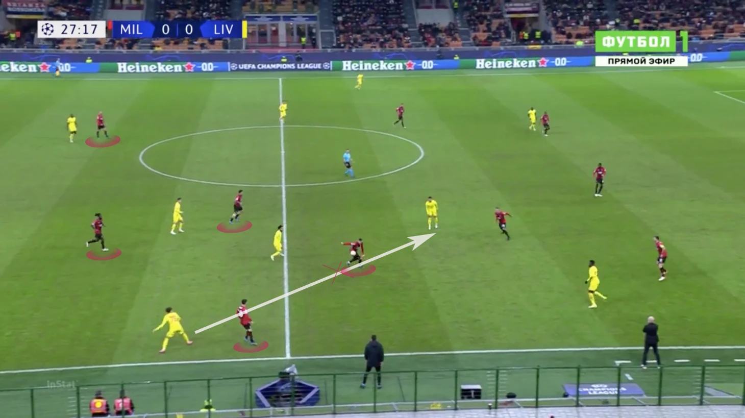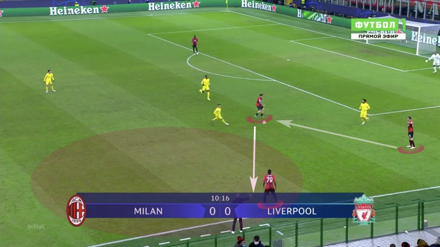 Делая такой акцент на фланговое продвижение в построении атаки, "Милан" пользовался компактностью блока соперника и относительной свободой в этих зонах, к тому же движение Кессье (этот паттерн, к слову, миланцы часто применяют и в других матчах) путало ориентировки "Ливерпуля". В итоге удавалось продвинуть мяч в среднюю треть поля, откуда хозяева начинали активную фазу атаки. Основной упор при обострении "Милан" делал на атаки пространства за спинами последней линии обороны. "Ливерпуль" всегда играет с высокой линией, а наличие неосновных исполнителей в конкретном матче еще больше приглашали соперника давить в эту точку. Именно тут бы очень пригодился Леао. Подобные атаки можно разделить на два основных типа. Первый – забросы из центральной оси во фланги, эксплуатирующие зоны за спинами крайних защитников. Там у хозяев особенно активно предлагал себя Тео Эрнандес, который часто оказывался изначально в высоких позициях, а его зону при билдапе занимал Кессье: