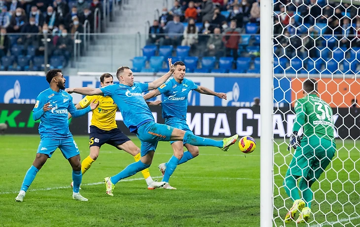Следующий момент на 40-й минуте. Дзюба принимает мяч в штрафной и разворачивается с ним, готовясь пробить. Осипенко, однако, сумел помешать и вынес футбольный снаряд в аут.