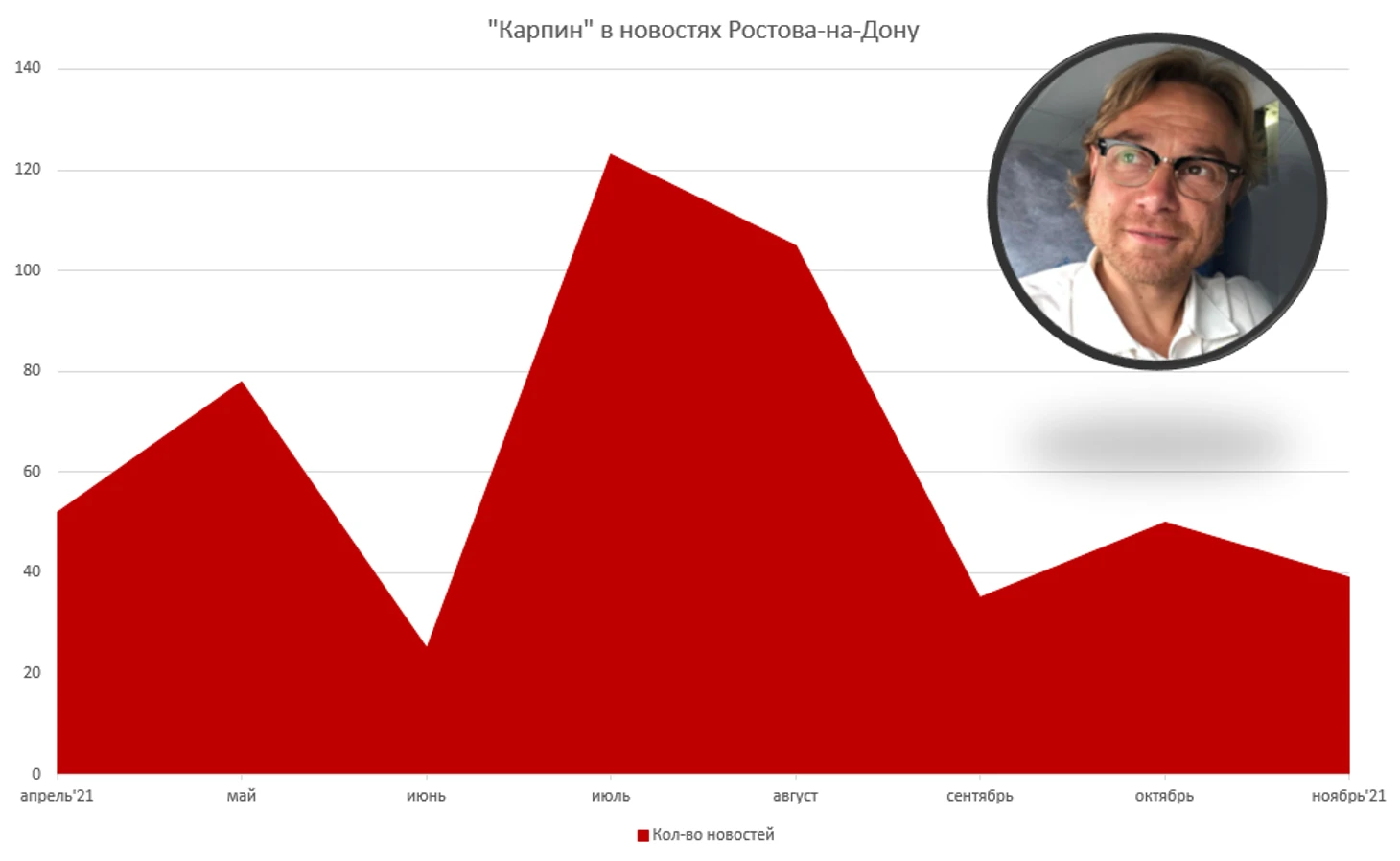 Главный тренер «Ростова» Валерий Карпин 23 июля официально возглавил сборную России. Этот факт явно напрямую повлиял на всплеск новостей в СМИ Ростова в июле, который показал более чем 2-х кратный рост по сравнению с предыдущими месяцами. А спустя 10 дней «совмещения» Валерий объявил об уходе из ростовского клуба со словами: «это очень сложное, мучительное решение для меня, но так будет лучше для всех — и для «Ростова», и для сборной России». Это событие спровоцировало ажиотаж и сохранило высокое количество новостей о Карпине в августе (это наглядно видно на графике).