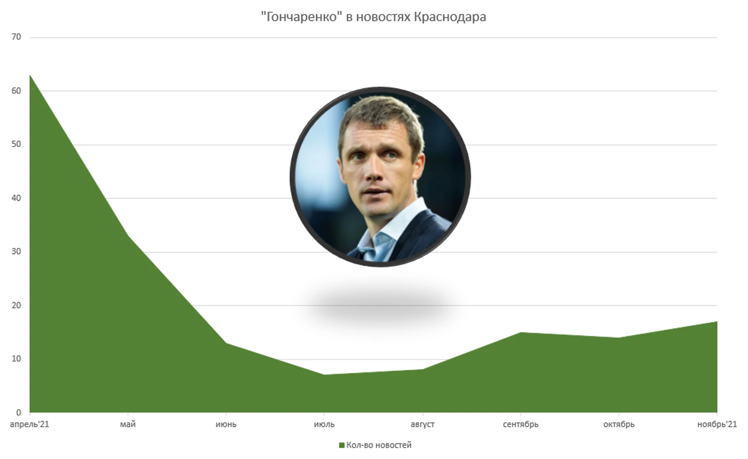 Долгожданное событие – смена главного тренера амбициозной футбольной команды «Краснодар», которая всё никак не может достичь тех результатов, которых от неё ждет владелец команды и болельщики! Несмотря на свои патриотичные принципы Сергей Галицкий 6 апреля выбрал Виктора Гончаренко на пост главного тренера своих «быков». За осенний период футбольный клуб вошел в топ5 и закрепился. Внимание в СМИ к результатам работы тренера сохраняется высокое – на графике это видно наглядно.