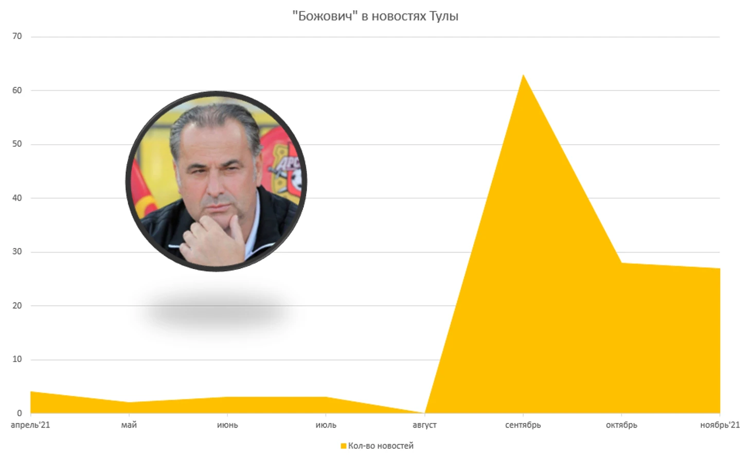 3 сентября стало известно, что в тренерском штабе тульского «Арсенала» произошли изменения – на пост главного тренера команды был назначен Миодраг Божович. Этот специалист тренировал довольно большое количество российских клубов, а в целом работает в России уже более 10 лет. За октябрь-ноябрь «канониры» отличились громкими победами над чемпионом страны «Зенитом» и московским «Локомотивом», что сохранило популярность упоминания Божовича в новостях тульских СМИ.