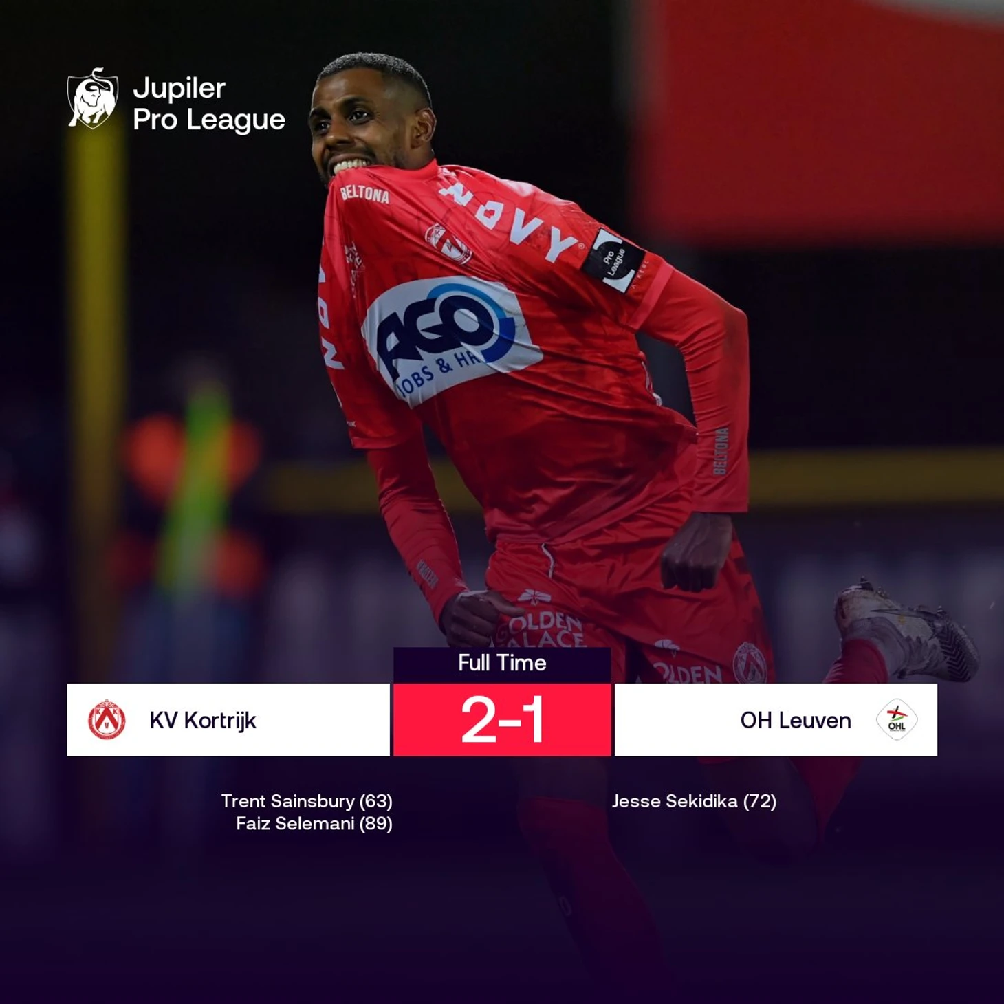 1. Фаиз Селемани – король концовок. Во втором туре он на 87-й минуте принес «Кортрейку» выездную победу над «Антверпеном», в 14-м туре на 89-й минуте спас команду от домашнего поражения «Берсхоту», а здесь на 89-й минуте принес ей домашнюю победу над «Левеном». При этом в последних четырех матчах Фаиз не отметился ни одним результативным действием, а в матче с «Эйпеном» не забил пенальти. После прошлого тура нападающий признался, что у него спад формы. «В последние недели он чувствовал себя немного хуже, поэтому этот гол для него, должно быть, очень важен и приятен», – говорит автор первого гола «Кортрейка» защитник Трент Сейнсбери.