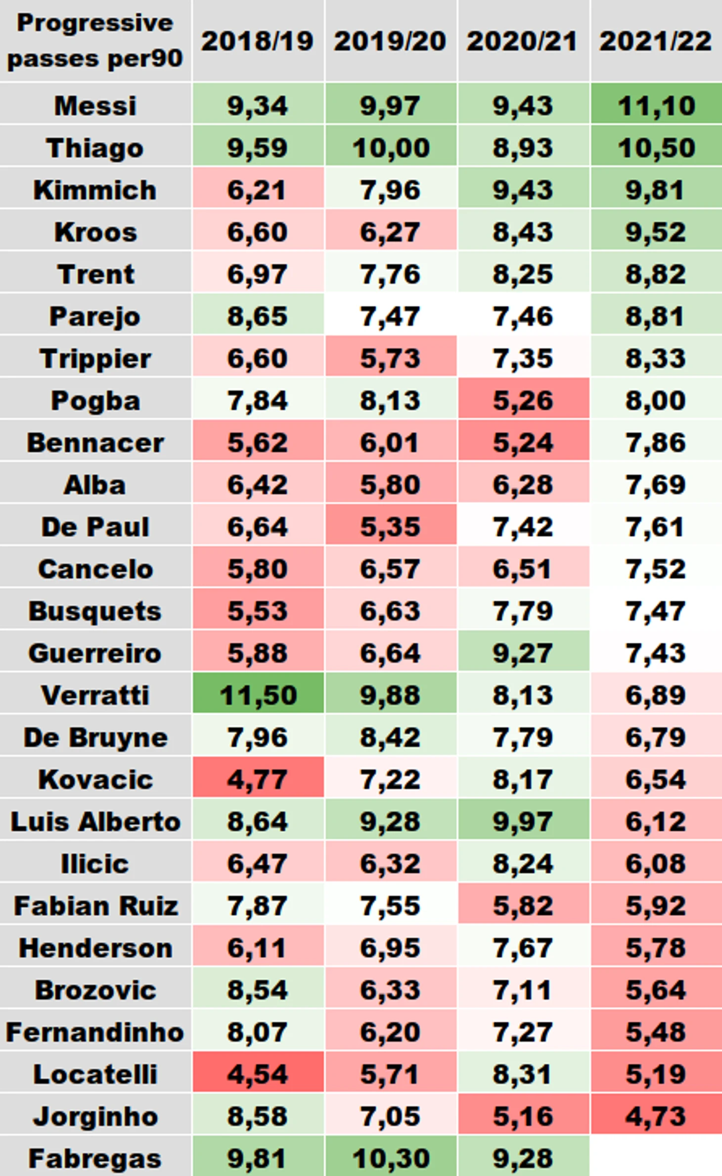 За последние 3,5 сезона стабильно в топе по таким передачам были Месси, Тиаго Алькантара и Сеск Фабрегас, данные которого за нынешнюю кампанию отсутствуют из-за совсем малого количества минут на поле(36). Киммих и Кроос стали совершать в 1,5 раза больше продвигающих передач, чем в сезоне 18/19. Стабильный Прогресс продемонстрировал и Трент Александер-Арнольд. Веррати же наоборот с каждым годом продвигает мяч все хуже (возможно экстремальное падение показателя в нынешнем сезоне связано с появлением Месси, который взял на себя часть его функций). Нельзя не отметить Парехо, Погба, Де Брюйне и Луиса Альберто. Все они стабильно хороши, разве что за исключением отдельных сезонов. Отбросив в сторону статистику, и просто глядя на имена всех этих игроков, можно сказать, что каждый из них и так славится своим великолепным видением поля и передачами. Подобной корреляции не будет ни с одним другим общедоступным показателем. Ассистов слишком мало и очень сильно разнится их сложность, а в числе лидеров по ключевым передачам часто оказываются вингеры, которые совершают много прострелов в штрафную. Так в сезоне 18/19 Райан Фрэйзер занял второе место в АПЛ по ассистам (14) и четвертое по ключевым передачам (2,4), но количество выполненных им за матч продвигающих передач не перевалило и за 4. Таким образом в список лучших ассистентов и лучших по ключевым передачам часто попадают игроки с откровенно говоря не самым высоким футбольным интеллектом. Но в топе по продвигающим передачам такое возможно лишь на коротком временном отрезке.