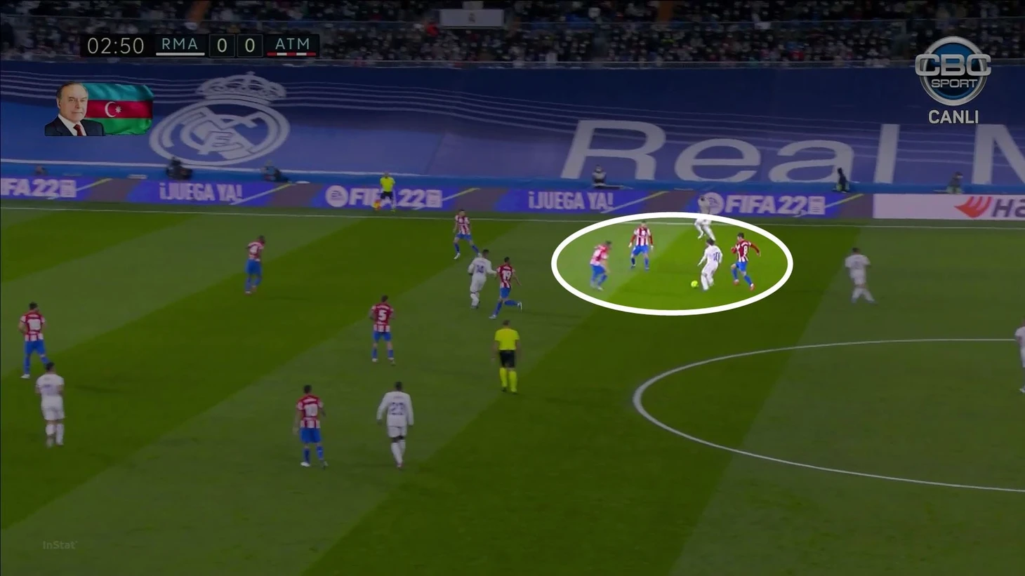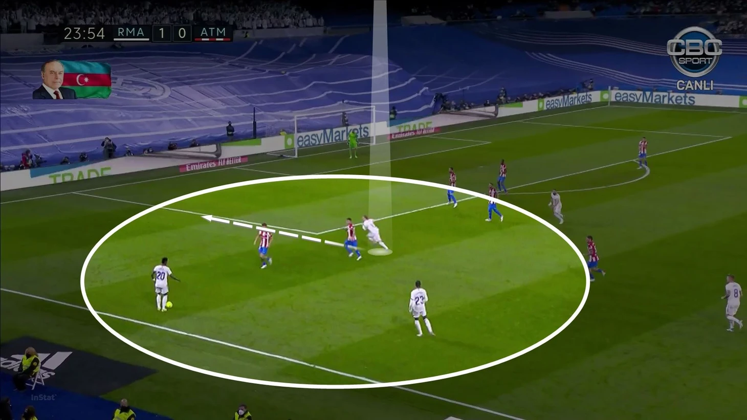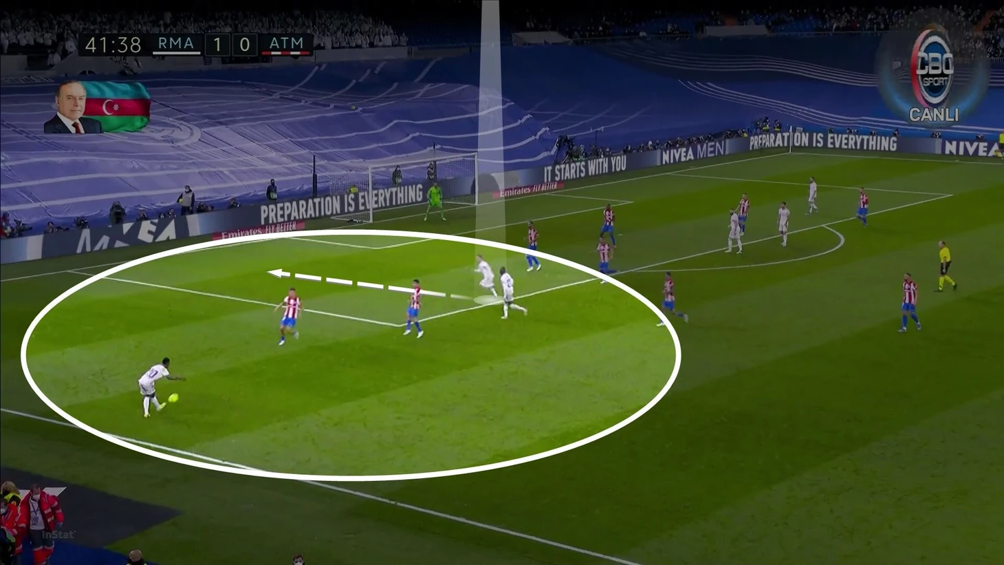 • Чтение маневра со смещениями форвардов «Атлетико». В такие эпизоды Каземиро становился центральным защитником, что позволяло Эдеру Милитао и Давиду Алабе действовать смелее.