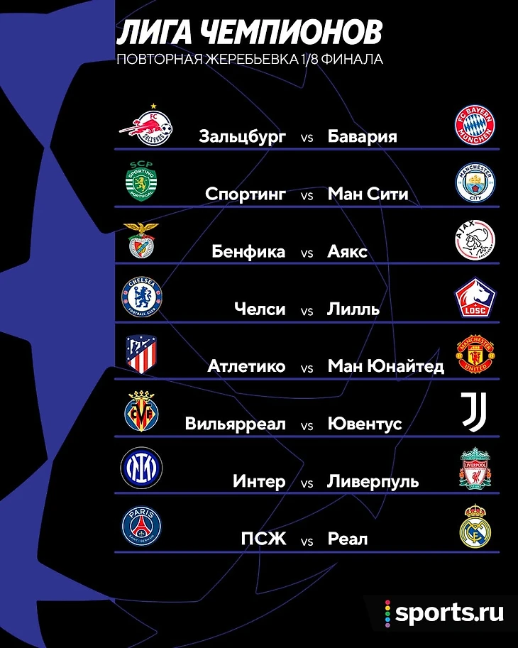 Даты матчей 1/8 финала: первые – 15/16/22/23 февраля, ответные – 8/9/15/16 марта.