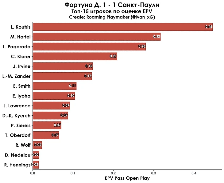 Вообще левая «восьмёрка» «Санкт-Паули» Марсель Хартель выбивается из всей массы футболистов в рамках указанной встрече. Он постоянно участвовал в интересных розыгрышах команды в роли созидающего игрока, что позволило ему стать вторым игроком во встрече по набору очков EPV от передач с игры (нон-шот метрика, демонстрирующая насколько игрок был ближе к голу через передачи).