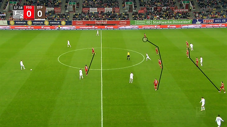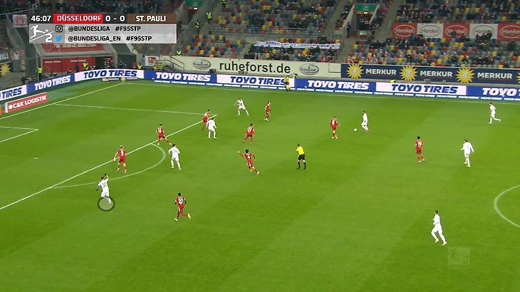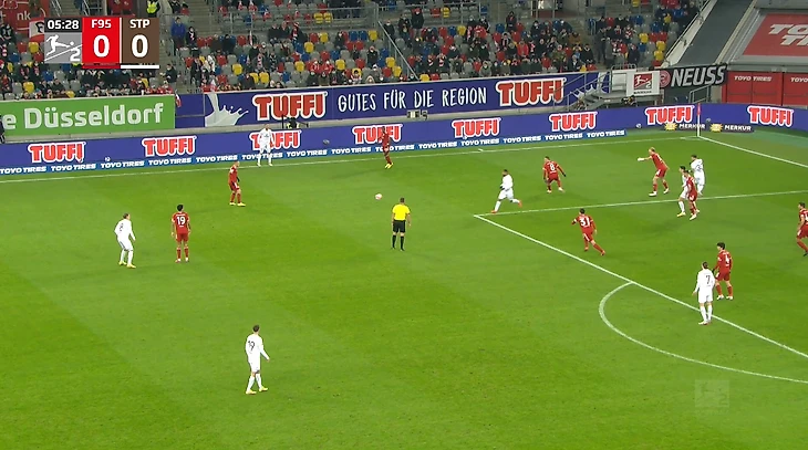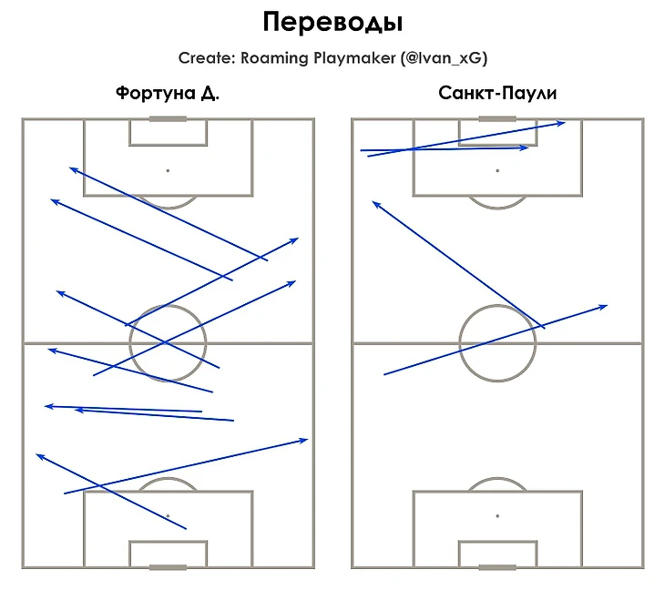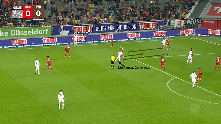 При этом команда из Дюссельдорфа прибегала к постоянным переводам с фланга на фланг, пытаясь нарушить позиционное построение соперника, либо достичь шанса, когда игрок в изоляции получит мяч и сможет атаковать свободное пространство.