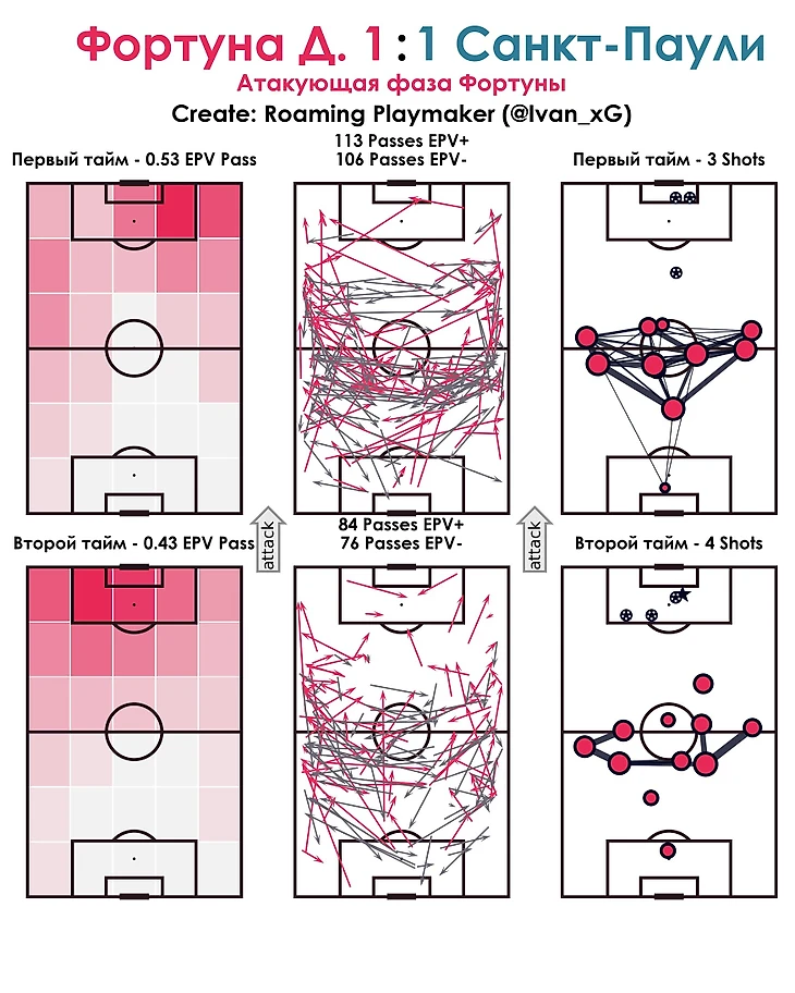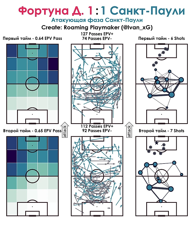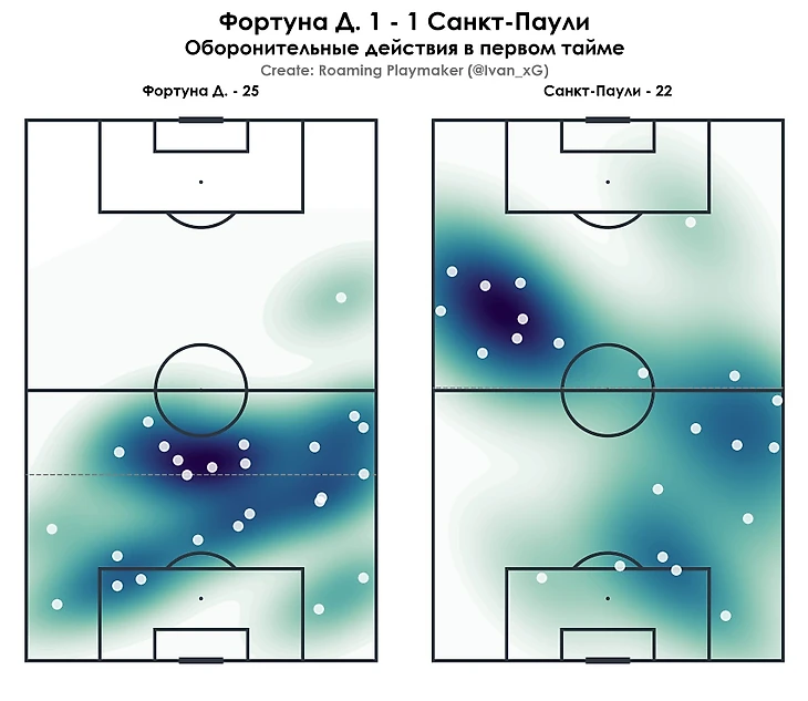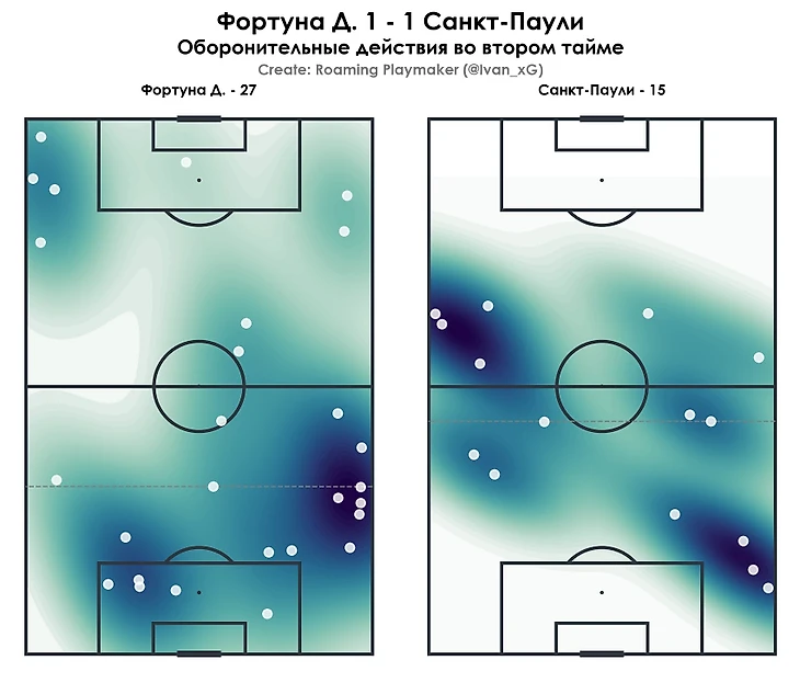 Окей, у меня нет таких глубоких данных. Только визуальные ощущения и тепловая карта. Но даже на карте видно, что да, у Дюссельдорфа между 45ой и 70ой минутами мяч был чаще, но игроки из своих почти 60% владения никакого продвижения в атаке не создали, и Санкт Паули был острее. Ну, да ладно.