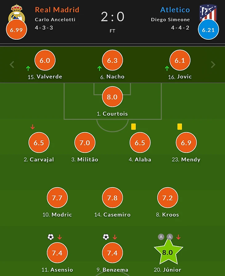 Винисиус несмотря на то что много обрезался и терял мяч в ненужных ситуациях всегда обострял игру впереди и держал защитников Атлетико в напряжении. Ну и конечно шикарные голевые передачи которые предрешили исход встречи 8.0