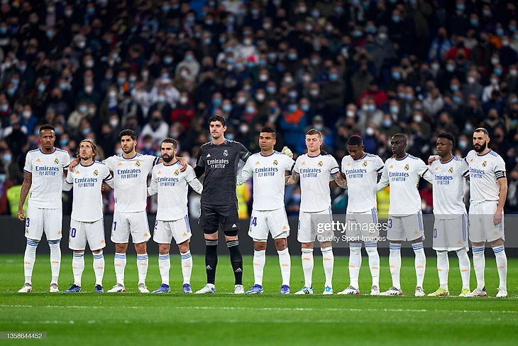 В старте на дерби вышел уже привычный состав : в воротах Куртуа, защитники с лева на право : Менди-Алаба-Милитао-Карвахаль, в центре полузащиты : Кроос-Каземиро-Модрич и трио атакующих : Винисиус-Бензема-Асенсио.