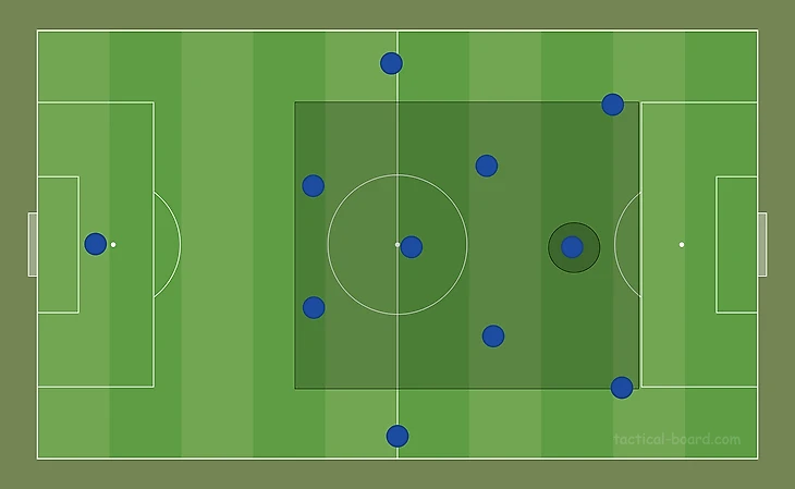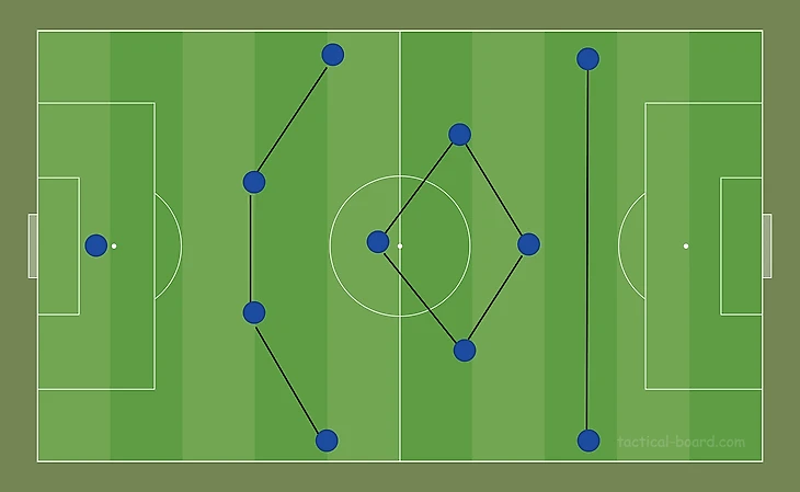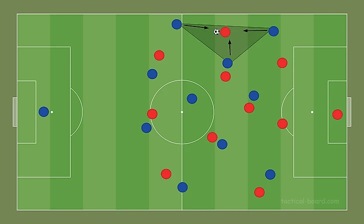 На флангах такое расположение футболистов поможет эффективнее накрывать соперника. Треугольник из крайнего нападающего, полузащитника и крайнего защитника сможет достаточно быстро прижимать игрока противника к бровке, тем самым вынуждая либо потерять мяч, либо совершить неточный пас.