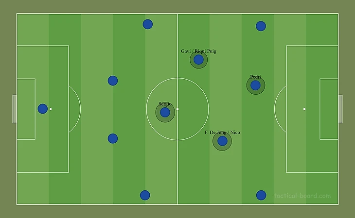 В последнее время игроками «Барсы», оставляющими наиболее яркое впечатление, являются полузащитники: Педри, Гави, Нико, Френки и продолжающий выступать на стабильно высоком уровне Бускетс - в них заключается основной потенциал нашей команды, поэтому наиболее очевидным видется вариант с внедрением наибольшего числа этих игроков в состав.