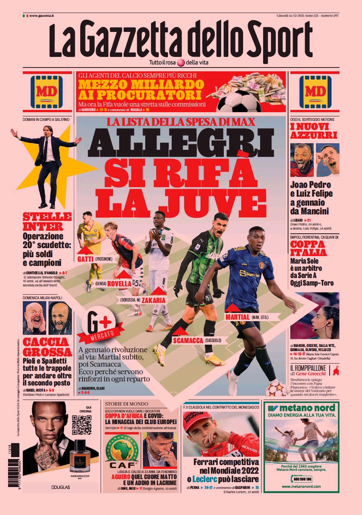 «Аллегри переделывает «Юве» – с таким заголовком вышла сегодняшняя Gazzetta. «Список трат от Макса. В январе начнётся революция: Марсьяль сразу, затем Скамакка. Вот почему необходимы усиления в каждую линию». Помимо пары нападающих в качестве целей указаны Закария («Боруссия М»), Ровелла («Дженоа») и защитник Гатти из «Фрозиноне».